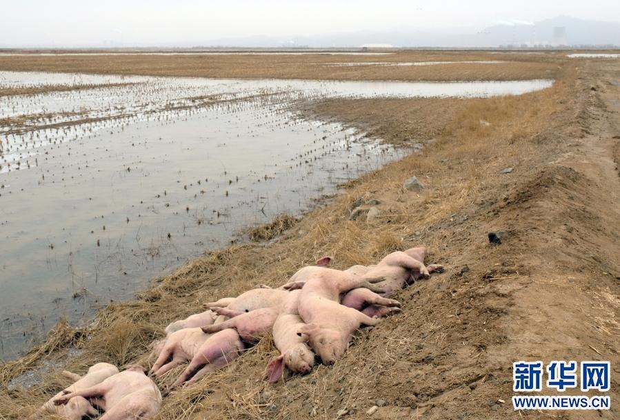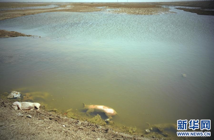 這是3月20日在達(dá)拉特旗黃河國(guó)堤內(nèi)拍攝的死豬。新華社記者 賈立君 攝