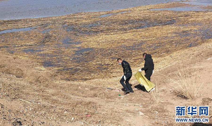 3月21日,當(dāng)?shù)卣块T(mén)派出的工作人員在達(dá)拉特旗黃河國(guó)堤內(nèi)收集死畜。新華社發(fā)