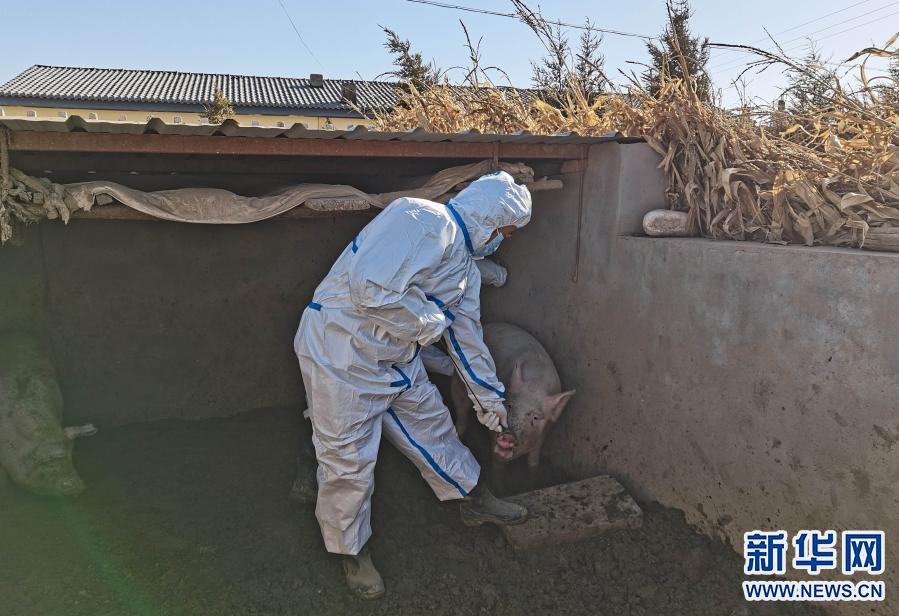 3月22日,達(dá)拉特旗疫控人員對(duì)農(nóng)戶(hù)養(yǎng)殖的生豬進(jìn)行檢測(cè)采樣。新華社發(fā)