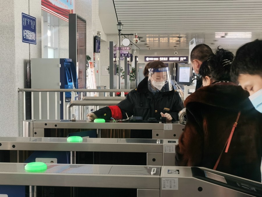 1月17日,春運(yùn)首日,集寧站烏蘭察布站客運(yùn)人員組織旅客通過閘機(jī)有序檢票進(jìn)站。