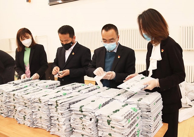教職工在給分裝好的教材貼郵寄單。李穎劍攝