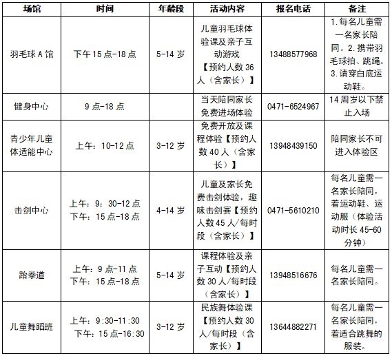 記者從內(nèi)蒙古體育館了解到,六一兒童節(jié)當(dāng)日,該館羽毛球、健身中心、青少年兒童體適能中心、擊劍中心、跆拳道、兒童舞蹈班為14周歲以下的兒童準(zhǔn)備了豐富的免費(fèi)體驗(yàn)活動項(xiàng)目。