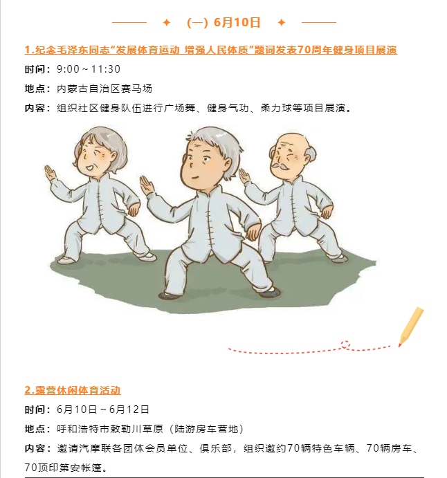 記者從自治區(qū)體育局獲悉,紀(jì)念毛澤東同志“發(fā)展體育運動,增強人民體質(zhì)”題詞70周年暨“歡樂草原健康內(nèi)蒙古”第十三屆全區(qū)全民健身運動會將于6月10日至11日歡樂開啟。