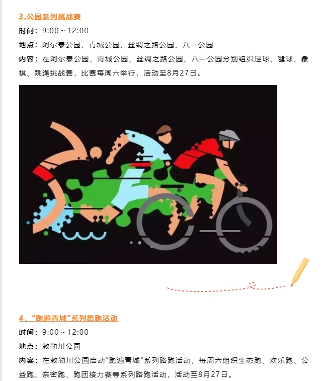 本次運動會認(rèn)真踐行“以人民為中心”辦賽理念,創(chuàng)新探索聚集少、規(guī)模小、符合大眾運動口味的內(nèi)蒙古賽馬場城市三項賽,包含跑步3000米、跳繩200個和動感單車騎行5公里3個項目比賽。此外,還將舉辦公園系列挑戰(zhàn)賽、“跑遍青城”系列路跑活動等,讓群眾在暢享運動的過程中盡情領(lǐng)略城市綠景的清新曼妙,進一步推動全民健身與全民健康深度融合。
