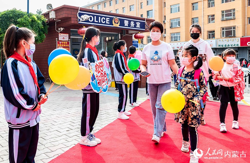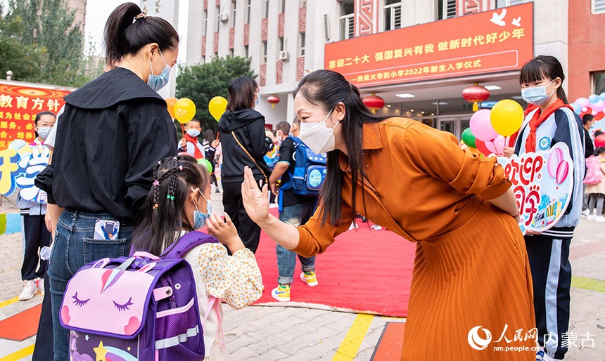 呼和浩特市玉泉區(qū)南柴火市街小學(xué)的師生們?cè)跉g迎一年級(jí)新生入校。丁根厚攝