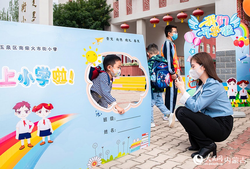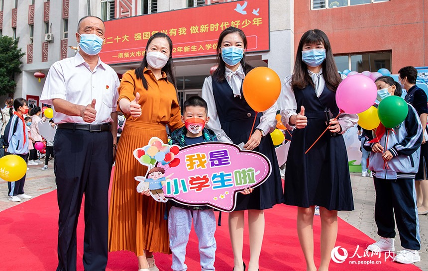 呼和浩特市玉泉區(qū)南柴火市街小學(xué)老師和一年級(jí)新生在校園內(nèi)留影。丁根厚攝