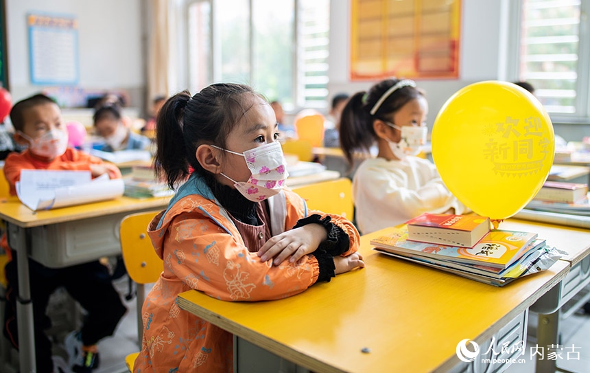 呼和浩特市玉泉區(qū)南柴火市街小學(xué)的一年級(jí)新生們坐在教室里上入學(xué)常規(guī)教育第一課。丁根厚攝
