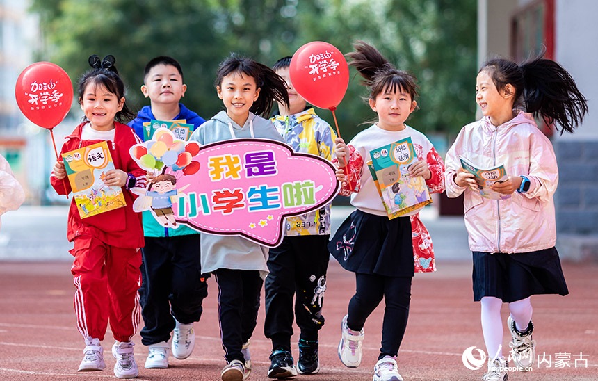 呼和浩特市玉泉區(qū)南柴火市街小學(xué)的一年級(jí)新生們手持新教材,開心的奔跑在校園內(nèi)。丁根厚攝