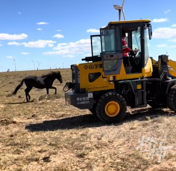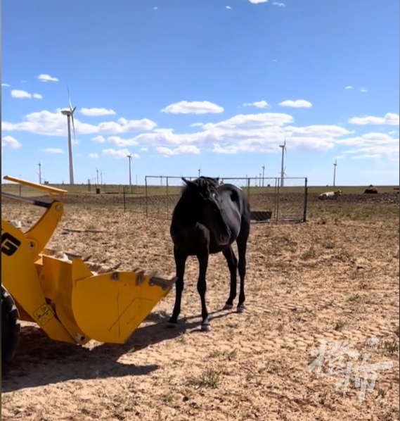 橙柿互動(dòng)留意到,視頻內(nèi)容顯示:一匹老馬躺在車斗里,車前車后,有兩匹馬兒在圍追這輛鏟車,甚至擋住車斗,鏟車被迫多次停下。