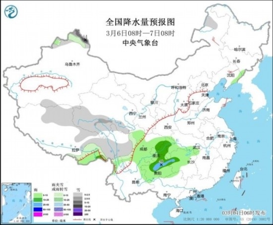 全國降水量預(yù)報(bào)圖(3月6日08時(shí)-7日08時(shí))