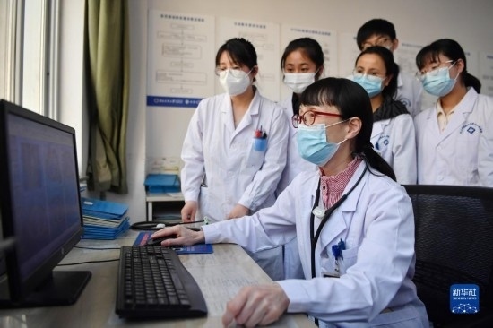 3月6日,馬娜(右二)和同事在病房內(nèi)查房。
