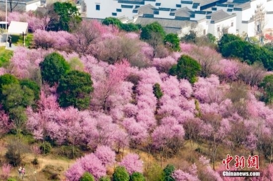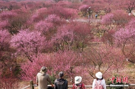 3月9日,江蘇南京,郊外盛開的梅花接連成片,呈現“粉色海洋”。中新社記者 泱波 攝
