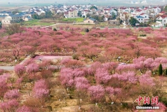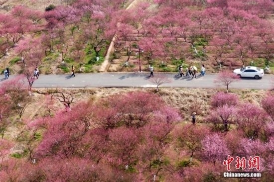 3月9日,江蘇南京,郊外盛開的梅花接連成片,呈現“粉色海洋”。(無人機照片)中新社記者 泱波 攝