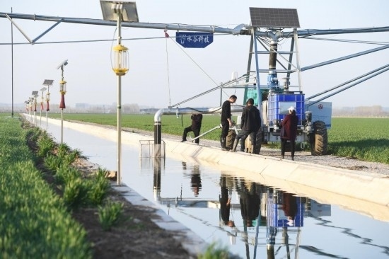 2月28日,在西平縣老王坡高標(biāo)準(zhǔn)農(nóng)田示范區(qū),劉亞輝(右)和王英凡在對(duì)平移式水肥一體化噴灌機(jī)進(jìn)行巡檢。