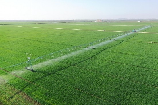 這是3月14日拍攝的西平縣老王坡高標(biāo)準(zhǔn)農(nóng)田里正在澆水的平移式水肥一體化噴灌機(jī)(無人機(jī)照片)。
