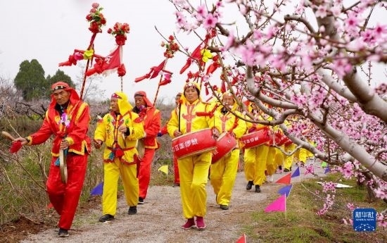 3月24日,在陜西省西安市臨潼區(qū)零口街道零塬村,當(dāng)?shù)氐姆俏镔|(zhì)文化遺產(chǎn)“百面鑼鼓”隊伍穿行于桃園中。