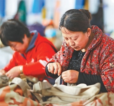 在河北省懷安縣柴溝堡鎮(zhèn)東洋河村一家箱包加工廠車間,就近就業(yè)的村民正在趕制訂單。武殿森攝(影像中國)