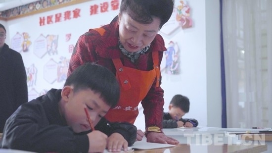 “這一筆要拉長,再拉長,對(duì)不對(duì)!”操著一口四川話的張惠英老人一邊把著孩子的手寫字,一邊微笑耐心地講解。在吉福社區(qū)的一間教室里,十來個(gè)孩子正在認(rèn)真地練寫漢字筆畫,而教他們書寫的張惠英并不是真正的教師,而是孩子們的“共享奶奶”。