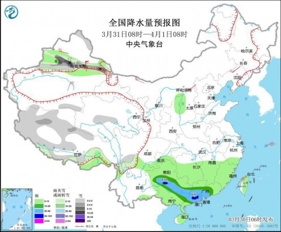 3月30日08時(shí)至31日08時(shí),新疆沿天山地區(qū)、西藏東部和南部、川西高原南部、青海東北部、甘肅東部等地部分地區(qū)有小到中雪或雨夾雪,其中,新疆沿天山等地部分地區(qū)有大雪(5~8毫米);新疆伊犁河谷、西藏東南部、西北地區(qū)東北部、四川東南部、重慶南部、貴州、云南東部、湖南南部、江西中南部、浙江、福建、廣西、廣東、海南島等地部分地區(qū)有小到中雨。新疆北部、內(nèi)蒙古中部、黑龍江東部、遼東半島等地部分地區(qū)有4~6級(jí)風(fēng)(見(jiàn)圖1)。東海大部海域有5~7級(jí)風(fēng),陣風(fēng)8級(jí)。