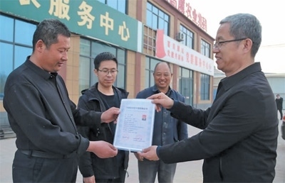 山東省平原縣鄉(xiāng)村振興服務(wù)中心工作人員為農(nóng)民農(nóng)藝師王篤春(左一)頒發(fā)證書(shū)。辛 凱攝