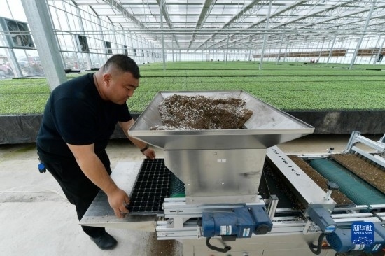 在張掖市甘州區(qū)黨寨鎮(zhèn)陳寨村,工作人員使用穴盤(pán)育苗機(jī)育苗(4月10日攝)。
