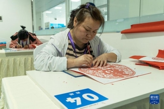 4月12日,在四川省綿陽市公共實(shí)訓(xùn)基地,參加剪紙項目的選手正在比賽中。