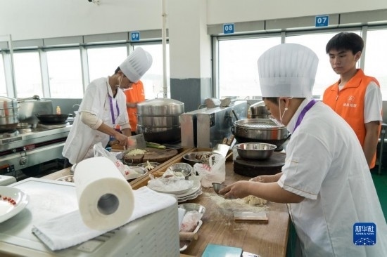 4月12日,在四川省綿陽市公共實(shí)訓(xùn)基地,參加中式面點(diǎn)項目的選手正在準(zhǔn)備食材。