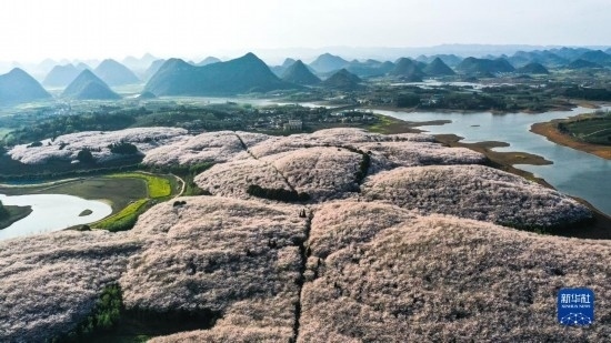 貴州省貴安新區(qū)櫻花園風(fēng)貌(3月21日攝,無(wú)人機(jī)照片)。