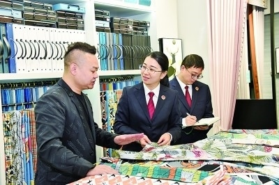 浙江省紹興市柯橋區(qū)被稱為“國際紡都”。2022年,柯橋區(qū)人民檢察院通過大數(shù)據(jù)監(jiān)督模型,監(jiān)督糾正62件花樣著作權虛假訴訟案件,入選2022年知識產(chǎn)權檢察十大案事例。圖為辦案人員在走訪商戶。柯橋區(qū)人民檢察院供圖