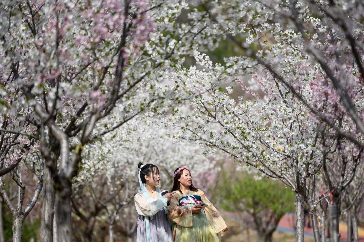 櫻花園里,各類櫻花搖曳生姿,爭相怒放,景色宜人,構(gòu)成一幅幅明麗的春日畫圖。前來觀賞的游客紛紛在櫻花樹下拍照打卡。