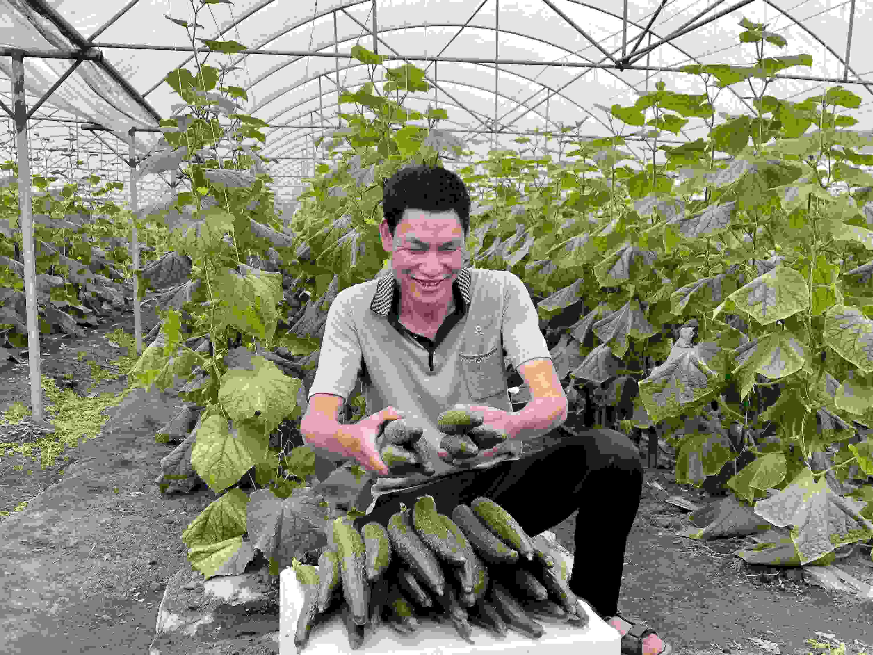 4月13日,邱福寧捧起剛采摘的黃瓜,臉上洋溢著豐收的喜悅。人民網(wǎng) 周靜圓攝