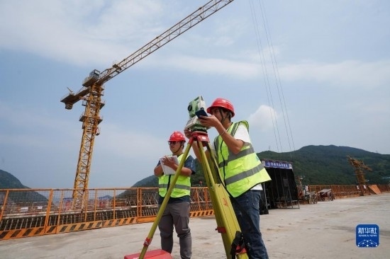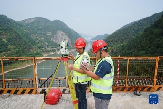 5月4日,在重慶市北碚區(qū)渝武高速復(fù)線觀音峽嘉陵江特大橋,中交一公局四公司橋梁工區(qū)工作人員孫培耕(左)和彭昭屏在對橋面高程及軸線偏位進行測量。