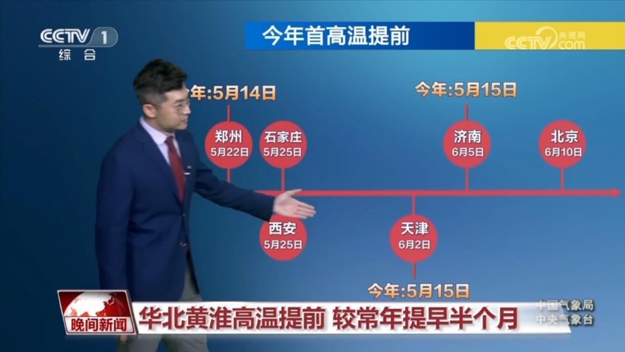 這輪高溫天氣過程,要比常年同期相對偏早。城市當(dāng)中,鄭州在5月14日,以及天津和濟(jì)南在5月15日都已經(jīng)出現(xiàn)了首個高溫日,而5月16日,石家莊和北京也有可能會出現(xiàn)高溫,要比常年同期偏早半個月左右。