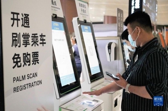 5月21日,乘客在北京大興機(jī)場線大興機(jī)場站的自助售票機(jī)前采集掌紋,開通刷掌乘車服務(wù)。