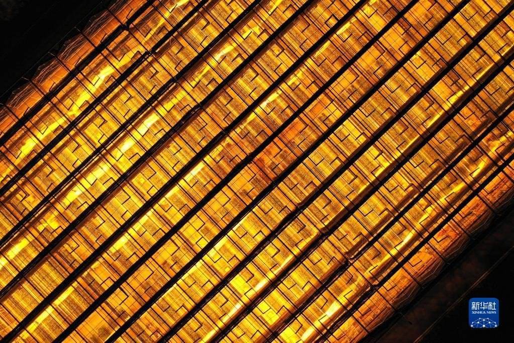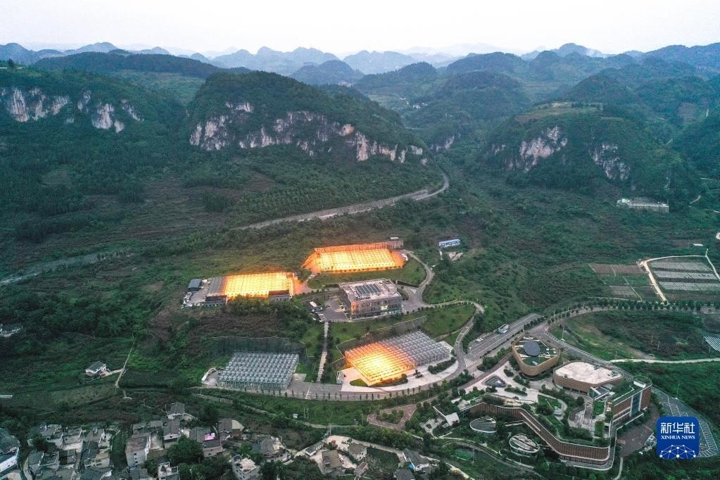 這是5月23日拍攝的貴陽市開陽縣南江蔬菜良種繁育中心育苗大棚夜間補光場景(無人機照片)。補光更有利于種苗生長,縮短育苗周期。