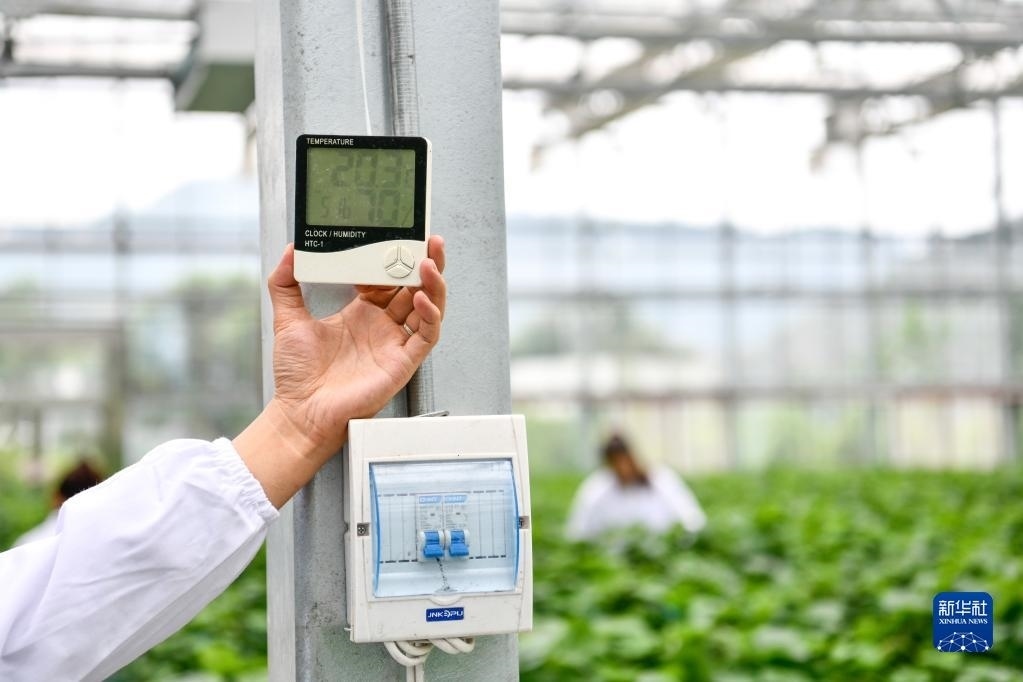 5月23日,工作人員在貴陽市開陽縣南江蔬菜良種繁育中心查看育苗大棚內溫濕度。