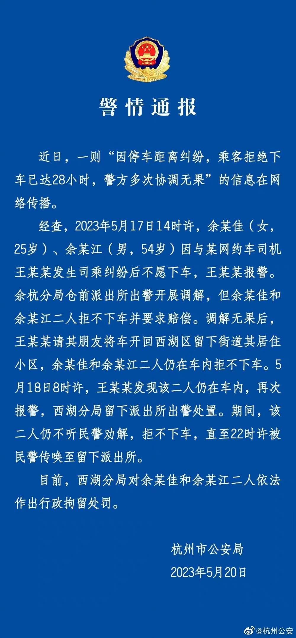 近日,杭州一名網(wǎng)約車司機(jī)稱,因兩名乘客打車點(diǎn)不能停車,商議在距離上車地點(diǎn)20米處等乘客。乘客上車后對(duì)司機(jī)大吼大叫,司機(jī)決定取消訂單。但上述乘客卻“賴”在網(wǎng)約車上拒絕下車,時(shí)間超過(guò)24小時(shí)。沖突期間警方曾前來(lái)調(diào)解,但勸說(shuō)未果。5月20日,杭州公安通報(bào),兩名乘客被行政拘留7日。