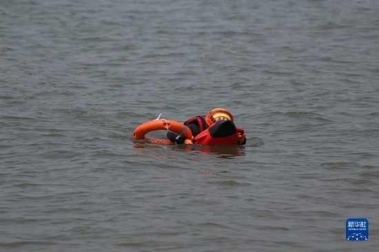6月2日,在水域救援實戰(zhàn)演習(xí)現(xiàn)場,一名模擬被困人員依靠智能水上救生遙控機器人回到岸邊。