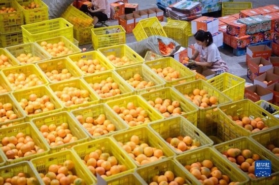 6月8日,在秭歸縣華維電商物流園區(qū)內(nèi),工作人員對(duì)臍橙進(jìn)行裝箱處理。