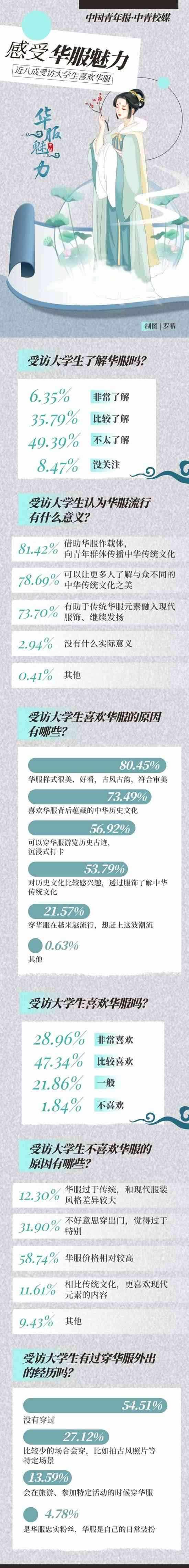 穿華服正在成為一些年輕人旅游或日常出行的選擇?!叭A服”,是指具有中華民族歷史文化基因、精神風(fēng)貌,且融合當(dāng)代審美的禮儀性服裝,其服裝風(fēng)格根植于中華傳統(tǒng)文化,傳承中華民族特質(zhì),體現(xiàn)當(dāng)代社會(huì)積極向上的時(shí)代精神,具有鮮明的辨識(shí)度,適用于國際交往、文化交流、商貿(mào)往來以及日常節(jié)慶、典祭等禮儀場合。自2018年起,每年的農(nóng)歷三月初三被選定為“中國華服日”,在前不久結(jié)束的第五屆“中國華服日”活動(dòng)中,上萬名青年華服愛好者匯聚活動(dòng)現(xiàn)場參與體驗(yàn)。近日,中國青年報(bào)社·中青校媒面向全國高校大學(xué)生發(fā)起問卷調(diào)查,共回收117所高校學(xué)生填寫的有效問卷1464份。調(diào)查結(jié)果顯示,76.30%受訪者表示喜歡華服,42.14%受訪者表示對華服有一定的了解。