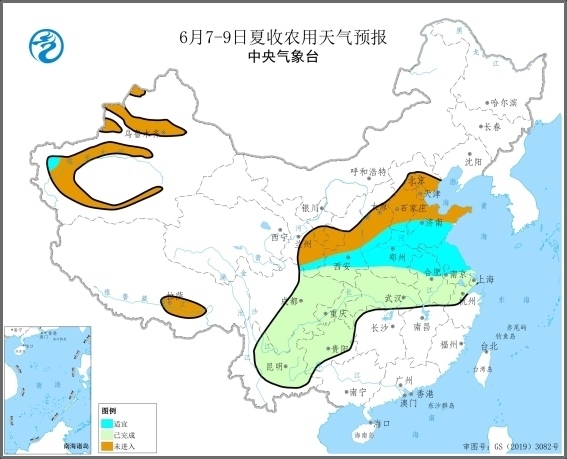 預(yù)計6月7-9日,夏收區(qū)大部多晴好天氣,利于搶晴收曬已成熟冬小麥和加快夏收進度;河南、陜西等地前期降水偏多地區(qū)的低洼麥田漬澇將減輕,為麥收機械化作業(yè)逐步創(chuàng)造條件。未來3天,河北中東部和南部、河南北部、山西東南部、山東西部、安徽東部等地的局部地區(qū)將有雷暴大風(fēng)或冰雹等強對流天氣,冬小麥點片倒伏風(fēng)險較高,對未成熟小麥籽粒充分灌漿不利,并將增加已成熟小麥機收難度。7-14日華北、黃淮、新疆等地部分地區(qū)將有35℃以上高溫天氣,局地日最高氣溫在37℃以上,上述地區(qū)堆積的濕麥發(fā)熱霉變的風(fēng)險較高,新疆冬小麥遭受干熱風(fēng)災(zāi)害的風(fēng)險也較高。