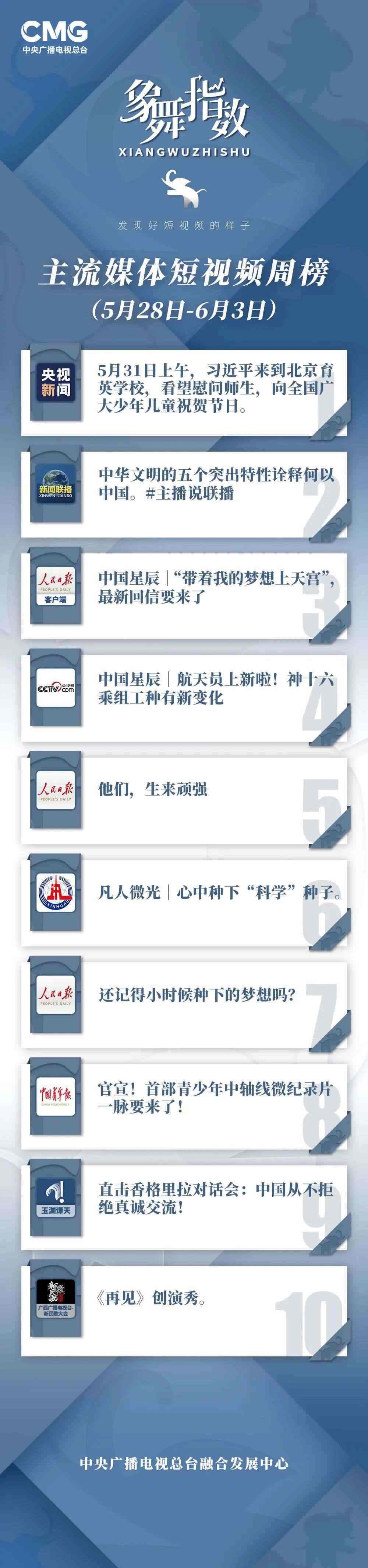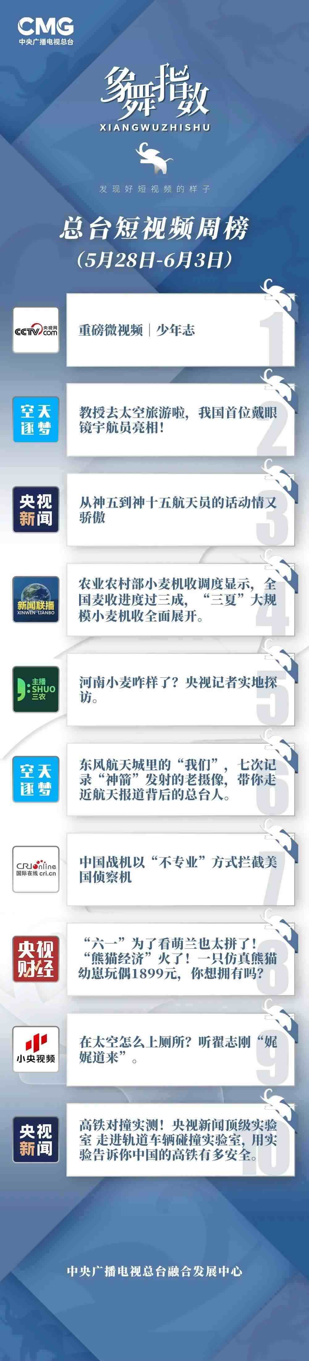 中央廣播電視總臺“象舞指數(shù)”評議品牌,推出主流媒體短視頻周榜、總臺短視頻周榜。在2023年5月28日—6月3日,這些內(nèi)容引發(fā)大眾關(guān)注:
