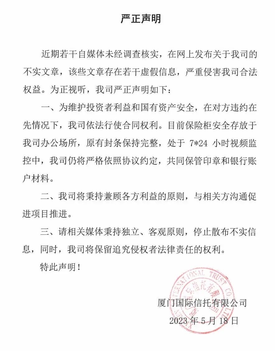 5月18日,廈門信托在官網(wǎng)和官方微信公眾號(hào)發(fā)布嚴(yán)正聲明稱,為維護(hù)投資者利益和國(guó)有資產(chǎn)安全,在對(duì)方違約在先情況下,我司依法行使合同權(quán)利。目前保險(xiǎn)柜安全存放于我司辦公場(chǎng)所,原有封條保持完整,處于7*24小時(shí)視頻監(jiān)控中,我司仍將嚴(yán)格依照協(xié)議約定,共同保管印章和銀行賬戶材料。此外,我司將秉持兼顧各方利益的原則,與相關(guān)方溝通促進(jìn)項(xiàng)目推進(jìn)。