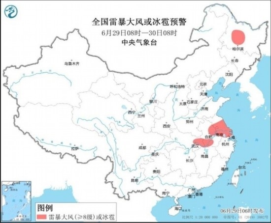 中央氣象臺6月29日06時(shí)繼續(xù)發(fā)布暴雨藍(lán)色預(yù)警和強(qiáng)對流天氣黃色預(yù)警:預(yù)計(jì),6月29日08時(shí)至30日08時(shí),黃淮南部、江淮、江漢中南部、江南北部、重慶東部以及黑龍江北部、內(nèi)蒙古東北部等地部分地區(qū)有大到暴雨,其中,湖北東部等地局地有大暴雨(100~150毫米)。上述部分地區(qū)伴有短時(shí)強(qiáng)降水(最大小時(shí)降雨量30~50毫米,局地可超過70毫米),黑龍江中部、安徽中南部、江蘇中南部、上海西北部、湖北東部等地的部分地區(qū)將有8~10級雷暴大風(fēng)或冰雹天氣,局地風(fēng)力11級,江蘇中南部局地可能伴有龍卷(見圖1和圖2)。強(qiáng)對流的主要影響時(shí)段為今天午后至夜間。