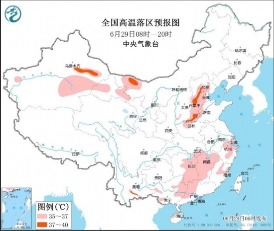 中央氣象臺6月29日06時(shí)繼續(xù)發(fā)布高溫黃色預(yù)警:預(yù)計(jì)6月29日白天,北京、天津、河北中南部、河南北部、山東西部、湖南東部、江西、浙江中北部、福建北部、廣西西部和東北部、廣東西北部以及內(nèi)蒙古西北部、新疆東部、甘肅河西等地的部分地區(qū)有35~37℃高溫天氣,其中,河北中南部、河南北部、新疆吐魯番盆地等地局地最高氣溫可達(dá)38~39℃(見圖3)。