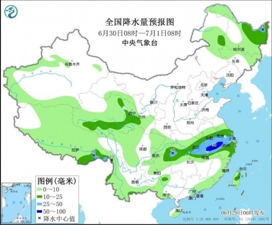 6月29日至30日,四川盆地、黃淮南部、江淮、江漢、江南北部、西南地區(qū)東部及東北地區(qū)等地有中到大雨,部分地區(qū)暴雨,湖北東部局地大暴雨,上述地區(qū)局地伴有明顯短時(shí)強(qiáng)降水、雷暴大風(fēng)或冰雹等強(qiáng)對流天氣。