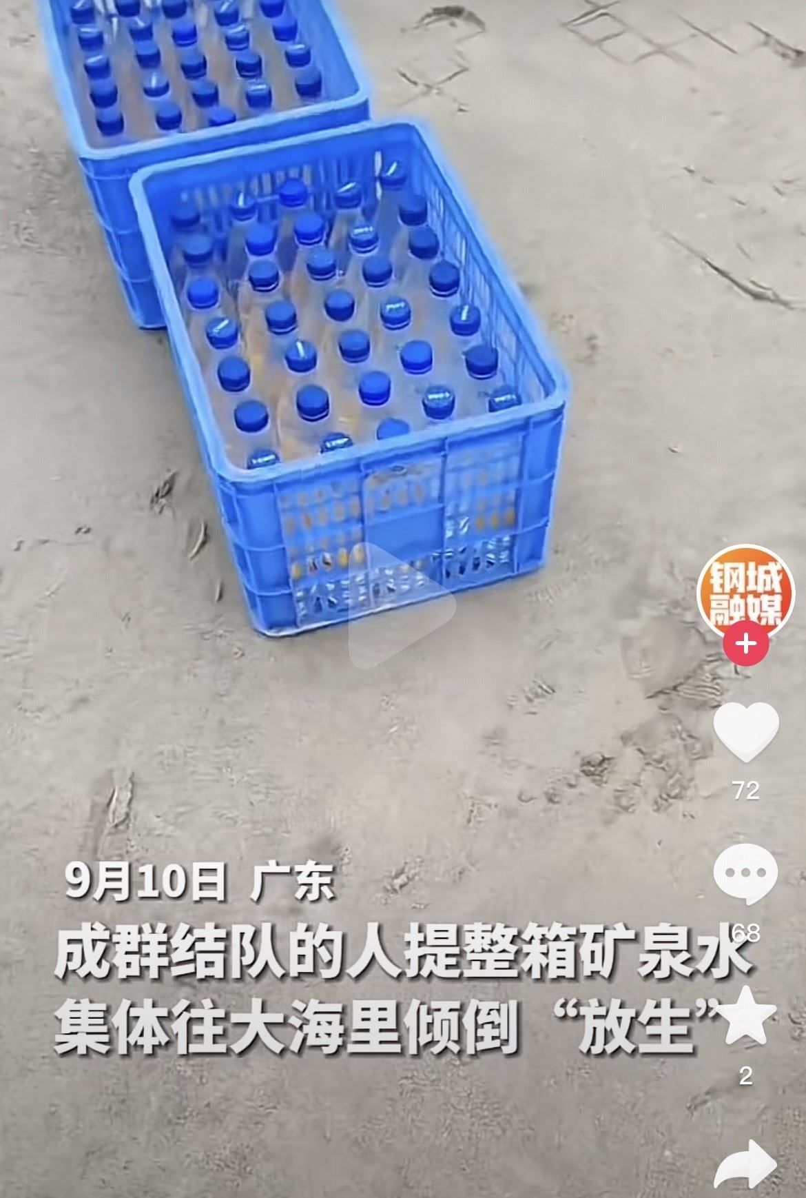 近日,有網友在社交平臺發(fā)布稱,廣東汕尾湖東港有一群人往海里“放生”礦泉水,60多箱礦泉水被浪費?,F場視頻顯示,一群人抬著藍色的箱子正往海邊走,箱子里可見擺放整齊的礦泉水瓶。視頻發(fā)布者介紹,9月10日下午3點多來了兩輛大巴,大巴上坐滿了人。