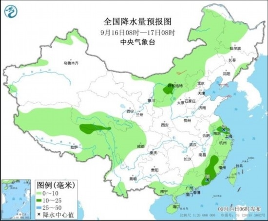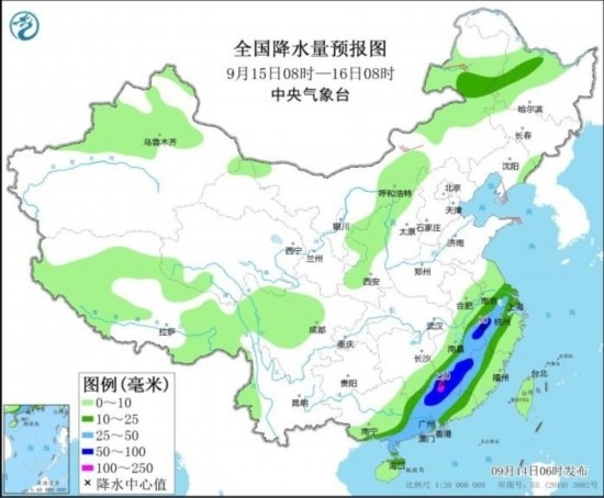 全國降水量預報圖(9月14日08時-15日08時)