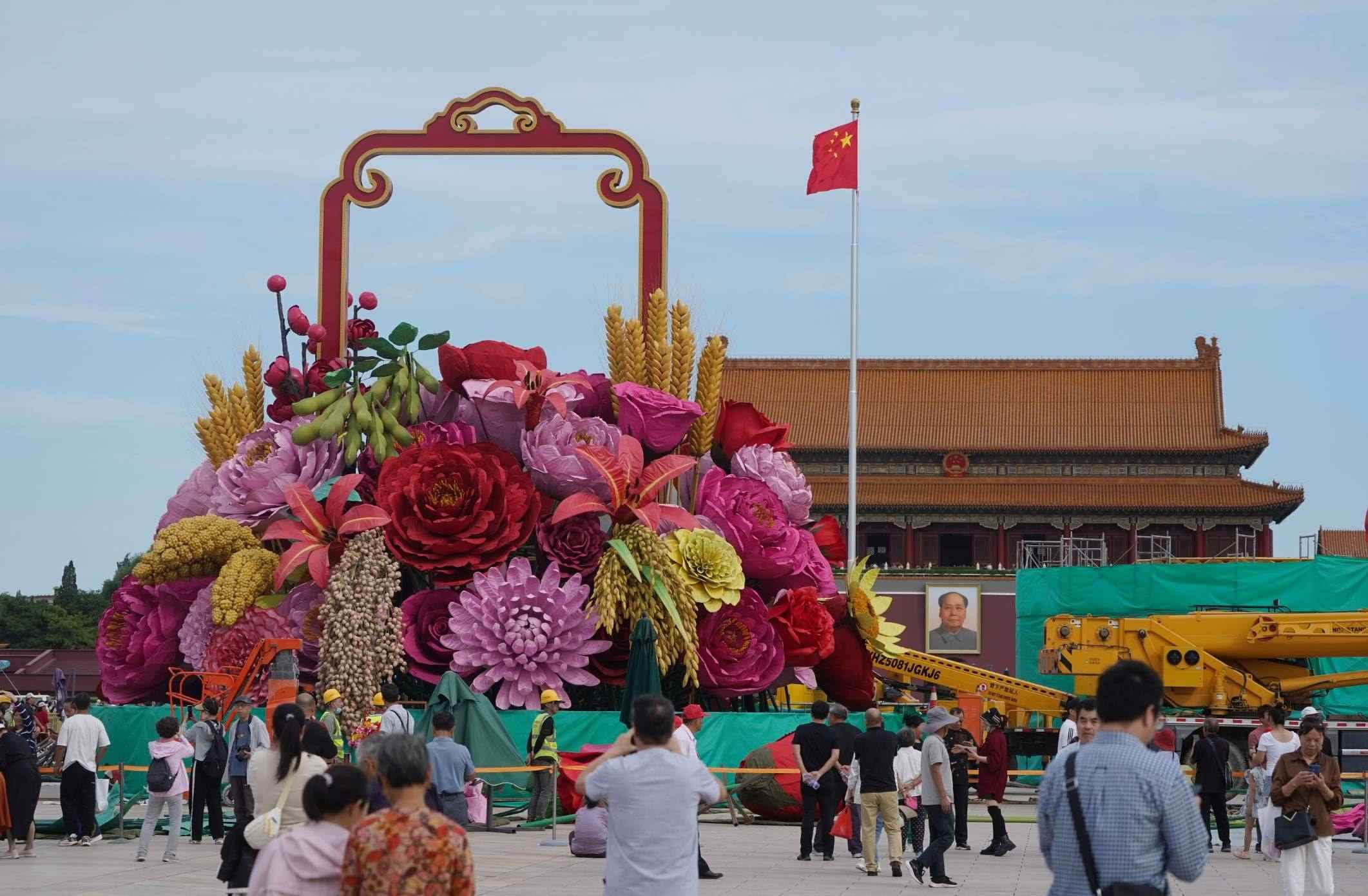 今年,天安門廣場中心的“祝福祖國”主題花壇以喜慶的花籃為主景?;@內(nèi)選取了擁有美好寓意的花卉和喜慶豐收的五谷(水稻、小麥、小米、黃米、大豆),體現(xiàn)花團錦簇、五谷豐登。