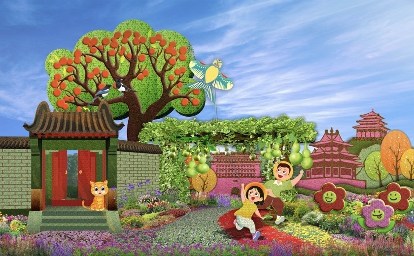 3,東單東南角的“共同富?!敝黝}花壇頂高達9.5米,以欣欣向榮的城鄉(xiāng)融合發(fā)展為場景,描繪了中國式現(xiàn)代化全體人民共同富裕的美好藍圖。